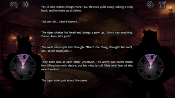 Demons Within is a furry, adult gay-focused visual novel where you see the world through the eyes of Resnick, a simple wolf soldier fighting to make the world better. Accompany the wolf from within as he interacts with his companions, friends... and enemies.