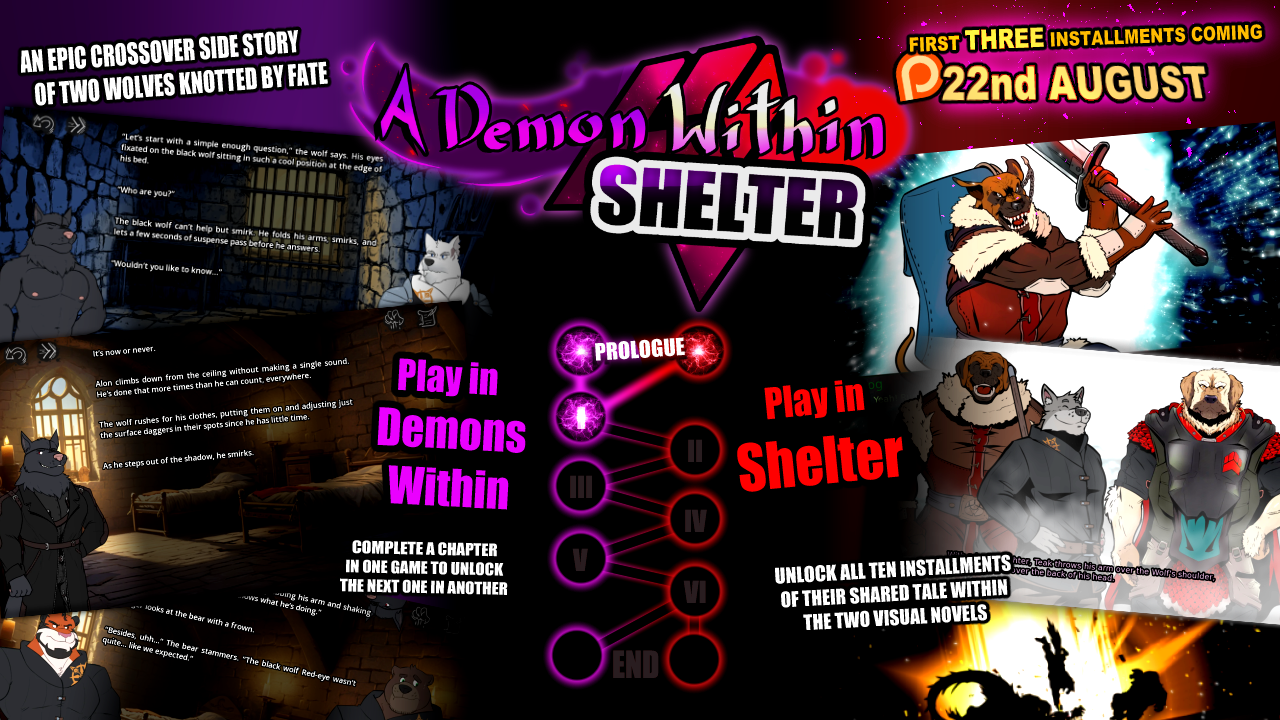 This release will happen simultaneously between Shelter and Demons Within! As specified before and explained in the promo image, you will need to progress through this story on BOTH games to progress!